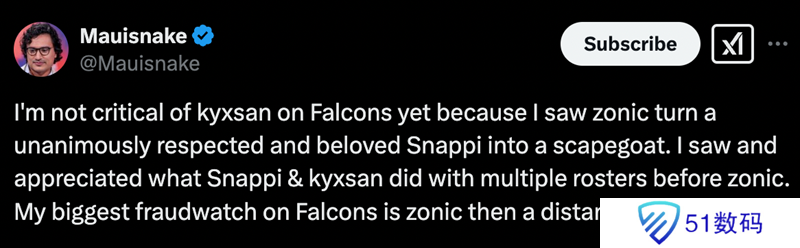 “我不会批评kyxsan在Falcons的表现是因为我知道zonic把大家一致都很尊重和爱戴的Snappi变成了替罪羊。在zonic来到队伍之前,我清楚的看到并欣赏Snappi和kyxsan在以前多个阵容中所做的一切。我认为Falcons队内最大的**就是zonic,其次就是Magisk。”