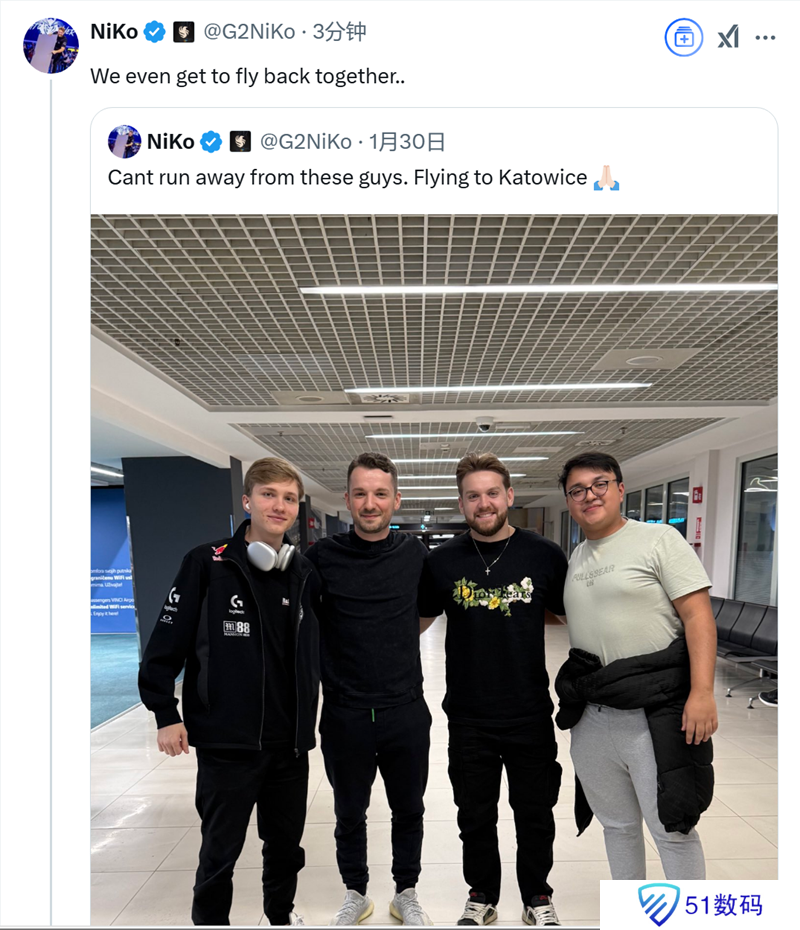 值得关注的是,NiKo效力的Falcons同样已经淘汰回家,这位波黑选手还在社媒上调侃了一下两队一起坐飞机回家的窘境。