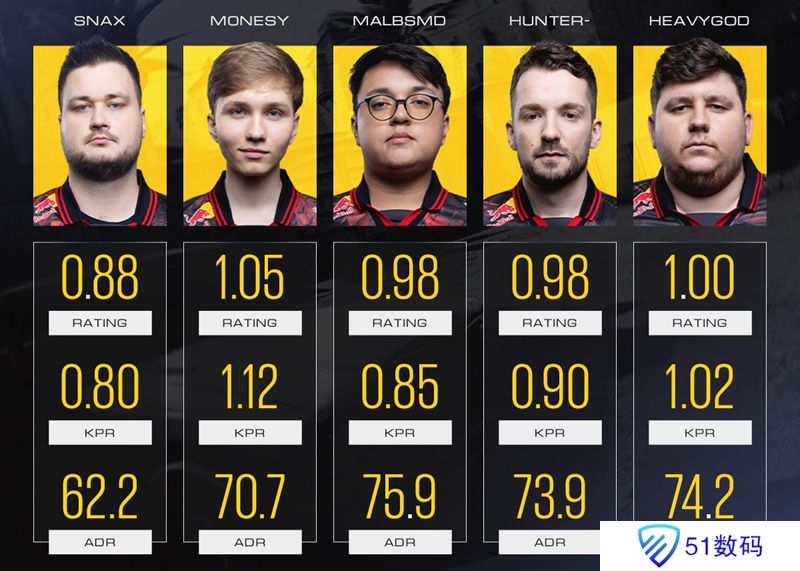 数据统计显示,队内仅m0NESY的Rating在1.0以上,其余三名选手malbsMd、Snax和huNter-的数据均跌破1.0线。新加入的HeavyGod虽交出1.0 Rating的及格答卷,但难以填补核心离队留下的战术真空。如今的G2面临火力不足的严峻挑战。