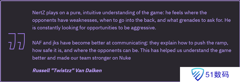NAF和jks在沟通方面有了进步:他们会说明如何推进铁板,那里的安全性如何,以及对手可能的位置。这帮助我们更好地理解比赛,也让我们在Nuke上表现得更强。”