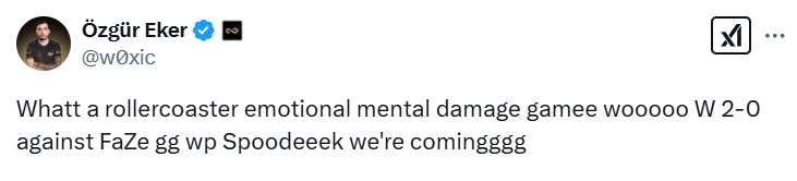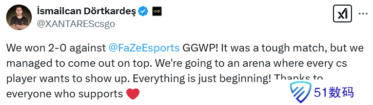 XANTARES:我们以2-0战胜了FaZe,比赛非常激烈,但我们成功取得了胜利。我们即将前往一个每位CS玩家都渴望进入的竞技场。一切才刚刚开始!感谢所有支持我们的人。