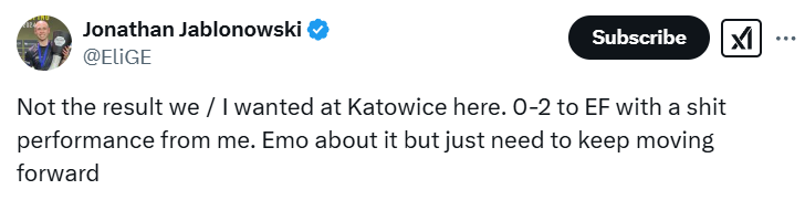 EliGE:在卡托维兹的结果并不是我所期望的。以0-2的比分输给EF,我的表现糟糕。对此我感到沮丧,但还是要继续向前迈进。