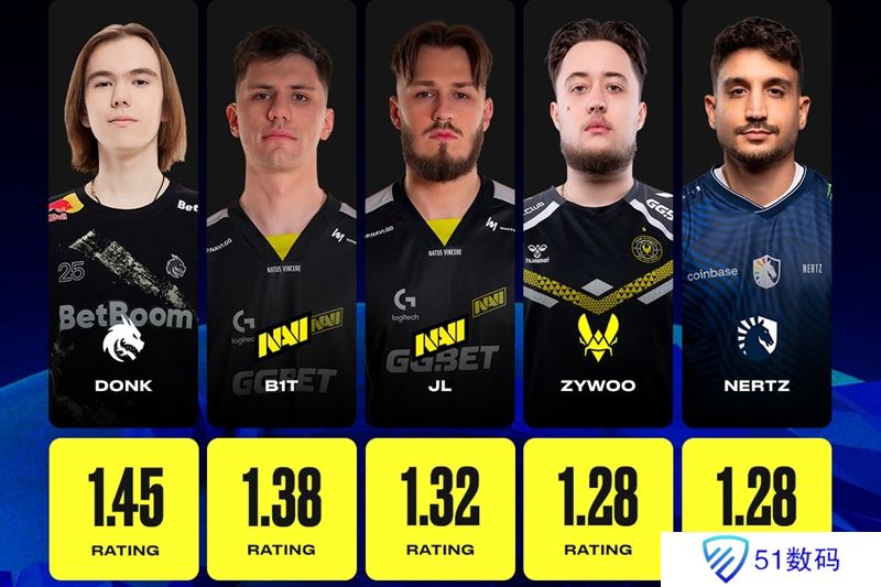 Spirit战队的donk以1.45的惊人Rating傲视群雄,稳居所有选手之首。与此同时,