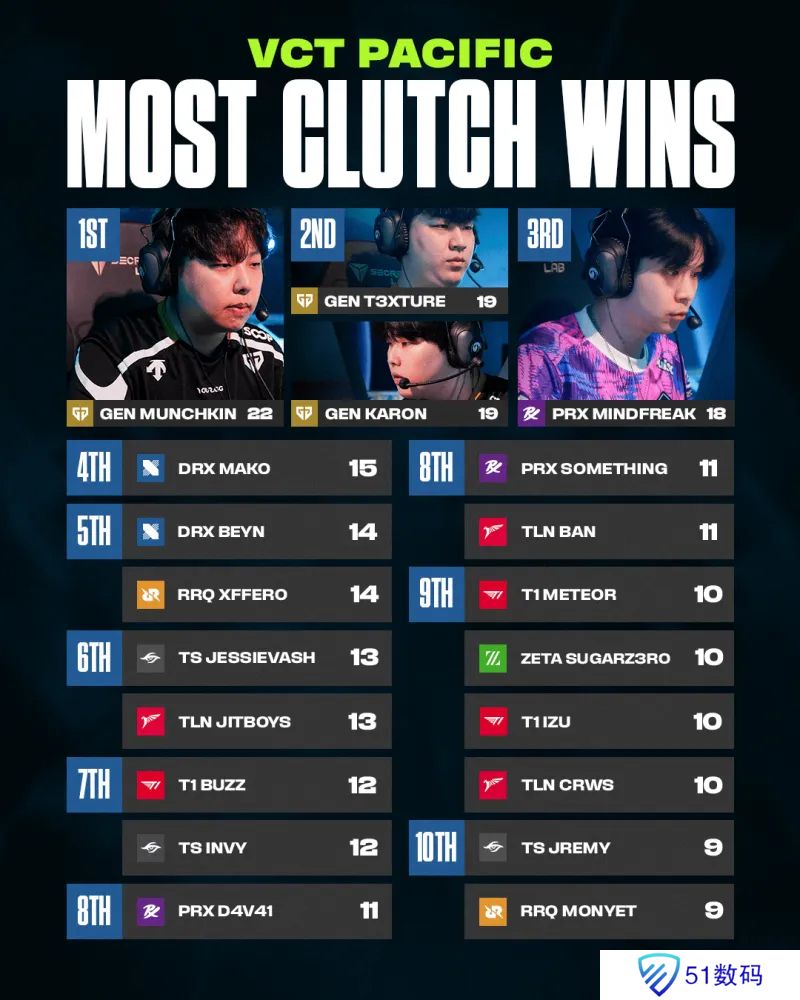 VCT PAC赛区残局胜场排名:GEN三人前二,mindfreak第三