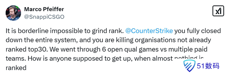 @CounterStrike(CS官方账号),你们完全把整个系统锁死了,这是在扼杀那些排名未进Top30的战队。我们已经打了6场公开预选赛,对手不乏付费队伍。几乎没有比赛能提升排名积分,那还让人怎么提升排名呢? ”