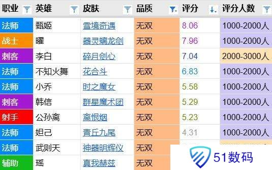 众所周知无双皮一直因高昂的获取成本而难获高分,直到今年的甄姬联动才首次突破八分门槛。螭龙剑再次做到了这一点,8.0的分数在无双皮中足以排名次席。