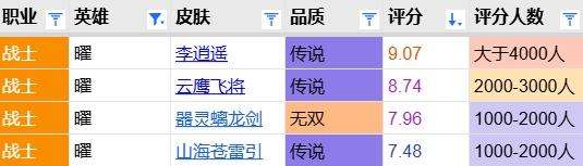 和甄姬不同的是,曜的皮肤品质非常高。在所有传说皮不少于三款的14位英雄中,曜是全传说平均分第二高的,达到了8.4分,仅次于鲁班七号。在这么强的纵向对比压力下,螭龙剑仍能获得8.0的分数,更显不易。