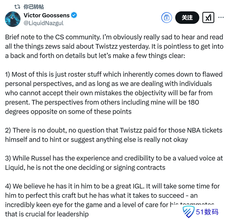 Liquid创始人兼联合CEO Victor Goossens在社交平台上回应了前教练zews在播客中对Twistzz的指责。