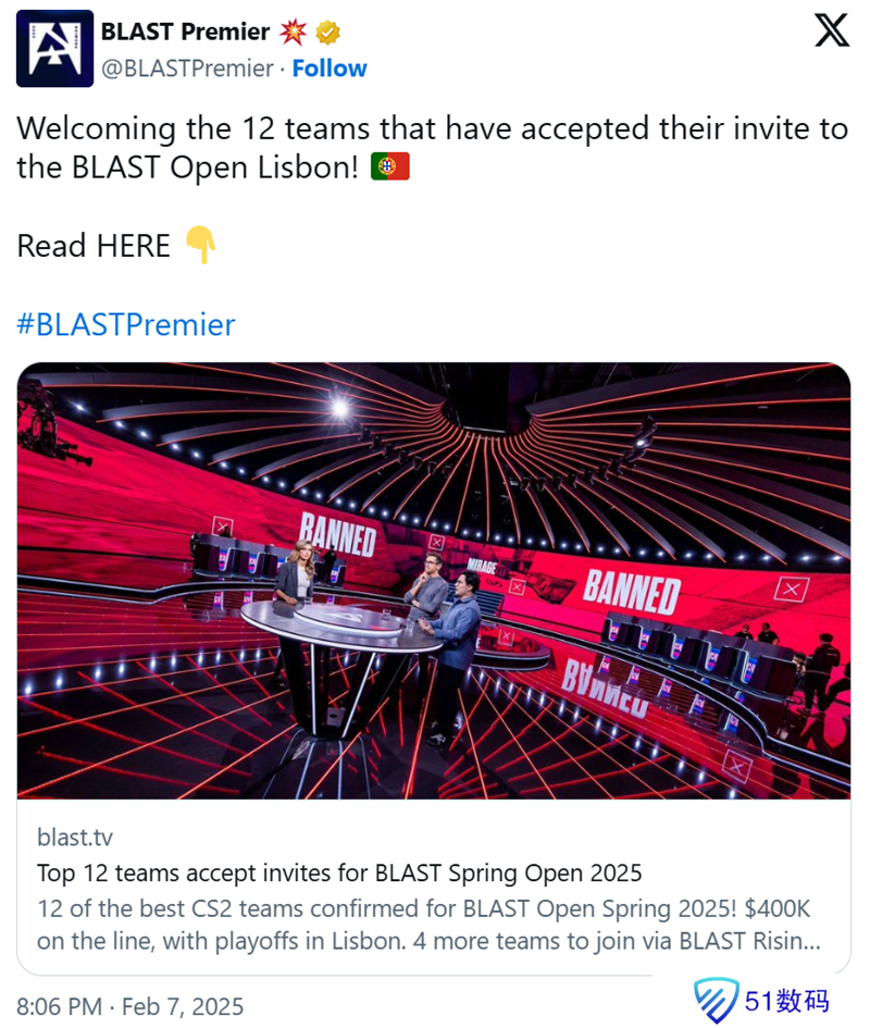 BLAST已公布了受邀参加2025年BLAST 公开赛 里斯本站的12支队伍。首先进行的是BO3双败淘汰赛小组赛,比赛将于3月19日至24日在丹麦哥本哈根拉开帷幕,