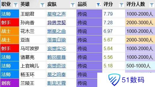 值得一提的是,从AOV搬过来的联动传限大多口碑一般,合计9款传说平均只有6.0分,且其中有多达6款都不足六分。但即便在这堆“卧龙凤雏”里面,星之鸣奏都是评分较低的,排名仅有倒数第二。