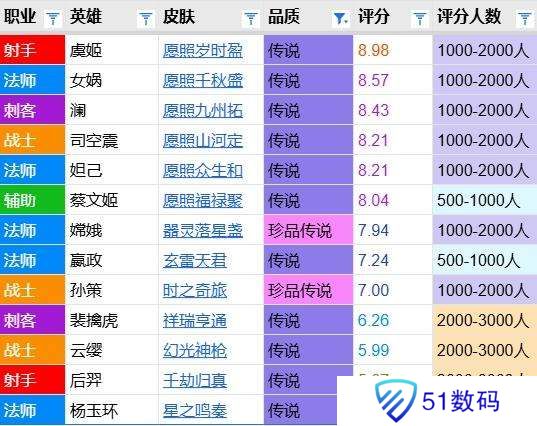 春节档一波冲刺后2025年已经上架了13款传说皮肤,平均分为7.3分。星之鸣奏的分数排名倒数第一,比累充负面加持的后羿传限都要更低一点。