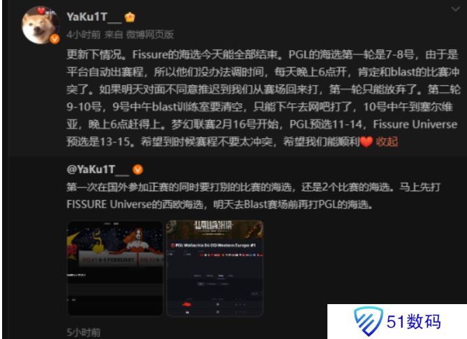 Yakult:更新下情况。Fissure的海选今天能全部结束。PGL的海选第一轮是7-8号,由于是平台自动出赛程,所以他们没办法调时间,每天晚上6点开(注:北京时间凌晨1:00),肯定和BLAST的比赛冲突了。如果明天对面不同意推迟到我们从赛场回来打,第一轮只能放弃了。第二轮9-10号,9号中午BLAST训练室要清空,只能下午去网吧打了,10号中午到塞尔维亚,晚上6点赶得上。梦幻联赛2月16号开始,PGL预选11-14,Fissure Universe预选是13-15。希望到时候赛程不要太冲突,希望我们能顺利。