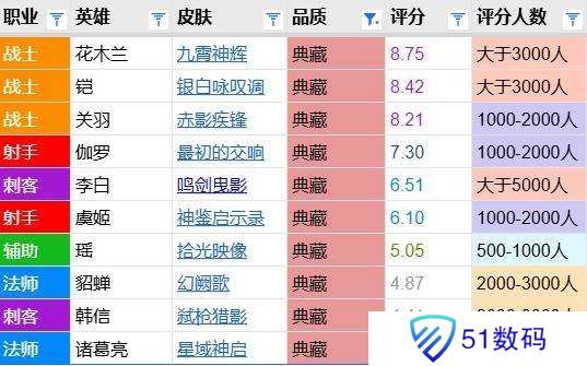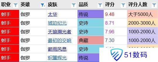 自21年上线即打分以来,这四年多共出了10款典藏,平均分为6.3分。最初的交响排名第四属中上游。值得一提的是前三名全部都是边路战士,即伽罗这款是非边路典藏的最高分。