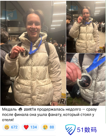 “zont1x的奖牌没保留多久——决赛刚结束,它就被送给了一位站在酒店旁的粉丝!”