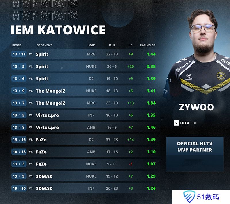 本次IEM卡托维兹站上ZywOo在共计12张地图的比赛中砍下1.42的平均Rating,他的Rating从未低于1.0,表现最不佳的比赛则是在小组赛迎战FaZe时打出,但那张地图Vitality以13-3轻松获胜。在关键总决赛中,他图二拿下2.38 Rating笑傲全场,帮助队伍拿到赛点。