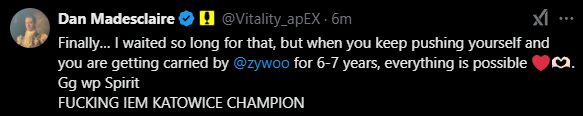 apEX:终于...我等了很久,但当你不断努力,并在ZywOo的带领下走过6-7年,一切皆有可能。