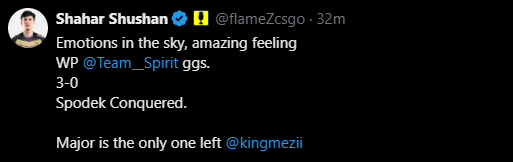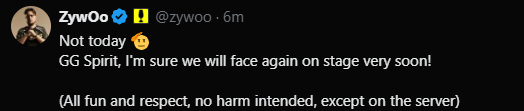今天不行,GG Spirit!我相信我们很快会在赛场上再次相遇的! (一切只是玩笑和尊重,并没有恶意,除了在赛场上)