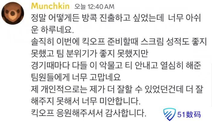 2025 VCT 太平洋启点赛败者组,GEN以2-3的比分不敌T1,无缘决赛与曼谷大师赛。赛后,Munchkin给粉丝们留言,大意如下: