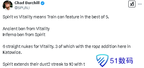Spirit在今天凌晨战胜NAVI后,将他们在Dust2上的连胜纪录延续至10场。”