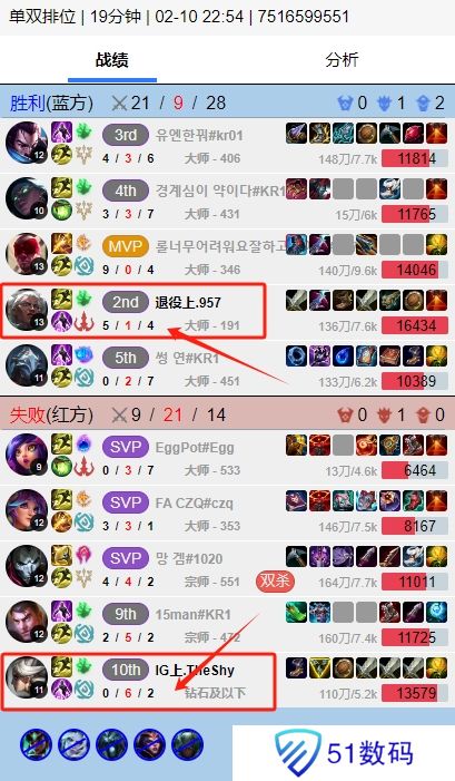 直播吧2月11日讯 昨日晚间,iG选手全员在韩服上进行Rank训练,而此前报道许久未上韩服的TheShy也使用大号进行韩服排位,其中一局中TheShy掏出青钢影遭遇前职业选手957,惨遭血虐被打出0-6-2的战绩,而957则使用狼母打出5-1-4的战绩。