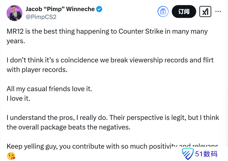 日前分析师Pimp在社交平台上发布动态,盛赞MR12是CS多年来最棒的改动。