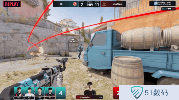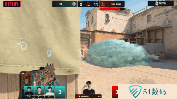 图二为LVG选择的Dust2,先作进攻方的UR包夹A区却没清大坑,在大坑的Emilia配合包点CT勾引拿下三杀,LVG赢下手枪局。第三局,UR假意中路爆弹实则A小进攻A区,z4kr狙击枪只换掉一人,随后花花在A大也没能顶住,少人的LVG选择保枪,UR拿下第一分。下一局UR则是中路包夹B区,双方人数互换后UR仅剩血量不多的两人,好在攻防转换后两名土匪拖足时间导致LVG没时间拆包,UR追平比分。连续丢分的LVG依旧有钱,他们依靠西瓜和z4kR的狙击枪阻止了UR对A小和B区的进攻,继续取得领先。随后两局双方都强起完成翻盘,第八局,又是花花藏在大坑击杀三个背身帮助队伍拿下第五分。这分过后UR彻底进入eco,eco回来长枪局他们在A大被z4kr狙击枪击杀三人,继续丢分,LVG这才将比分拉开。上半场结束,LVG以9-3**分领先。