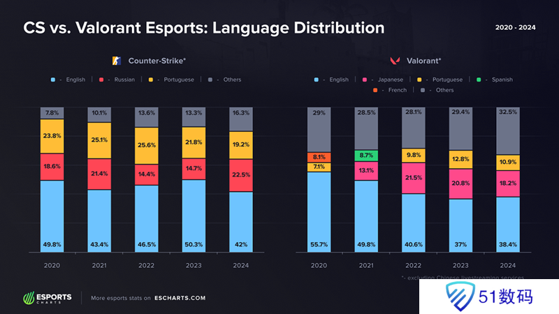 说到地区观众的偏好,近年来这两款游戏都出现了一个重要趋势,那就是英文流在整体观众中的份额下降。例如,在Valorant中,英文流的份额在其推出当年就超过了50%,而在CS中,英文流的份额则从2016年的70%以上下降到了2024年的42%。