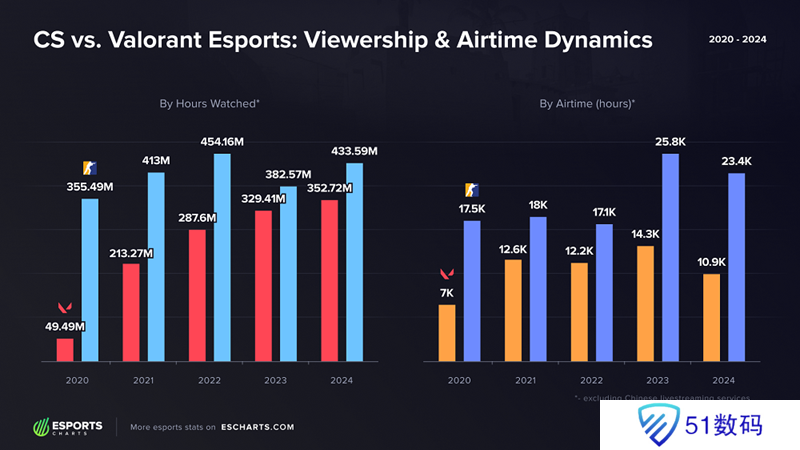 2023年,Valorant比以往任何时候都更接近于在电竞直播总收视率方面与竞争对手(CS)不相上下,仅落后14%。这是两款射击游戏竞争中的一个重要里程碑。相比之下,在Valorant推出的那一年,其电竞收视率落后于CS将近86%。随着时间的推移,差距逐渐缩小,2021年缩小到48%,2022年缩小到36.6%,2023年该差距缩小到14%,虽然2024年的差距略有扩大,达到了18.6%,但2023年仍是Valorant赛事具有里程碑意义的一年。