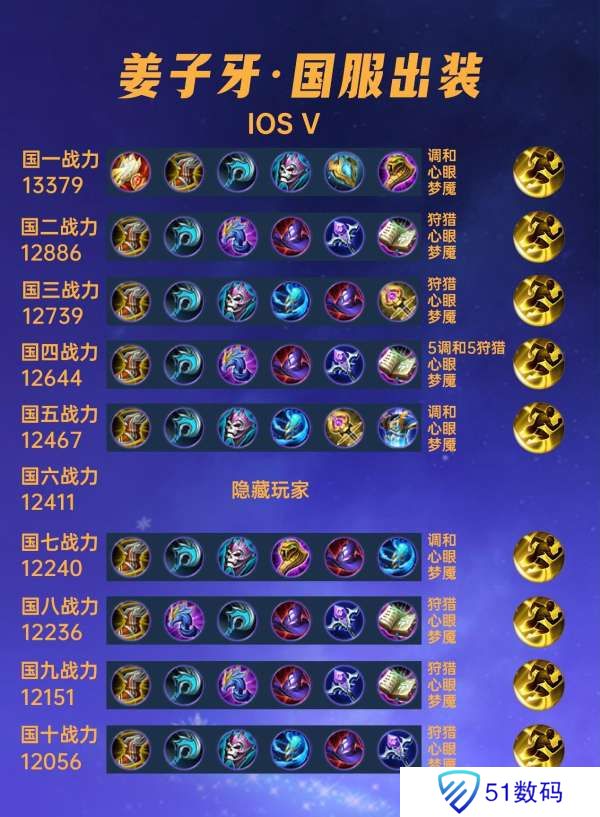 先做一个统计,40位国服姜子牙中有4位是走辅助位的,其余除隐藏玩家外都是走中路的。
