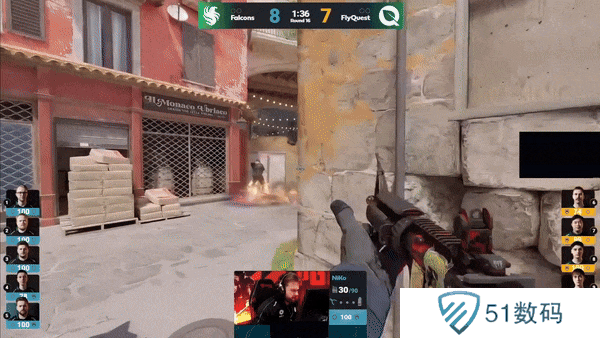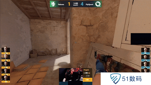 FlyQuest先做进攻方。手枪局,Falcons爆弹打B,CT做到二换二,Magisk关键时刻双杀拿下手枪局。