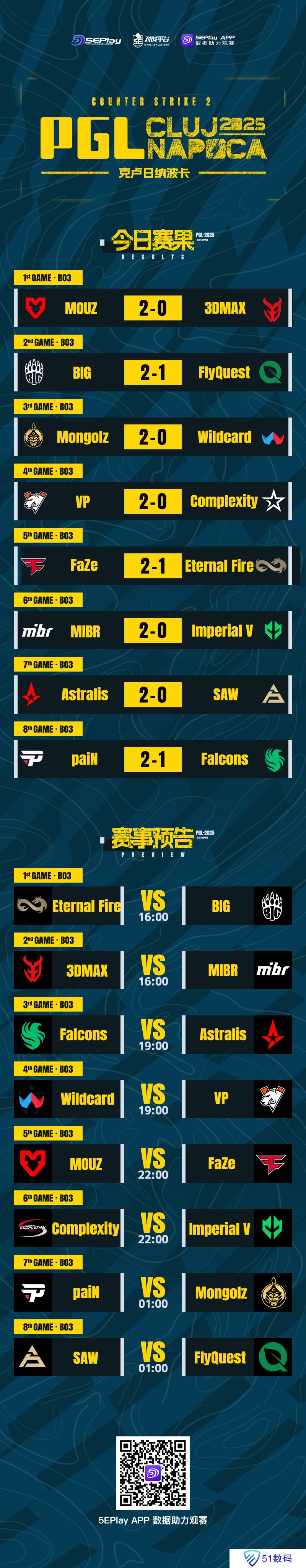 MIBR则也是在今日取胜,从0-1组进入1-1组。明日1-1组将会有Falcons迎战A队,2-0组则会迎来晋级之战,MOUZ对阵FaZe。以下为今日赛果、明日预告一览: