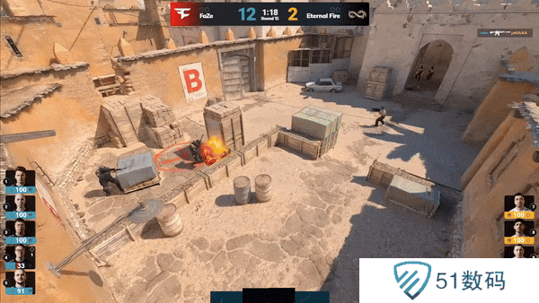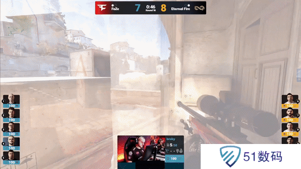 下半场攻守互换。EliGE中路先爆一人,frozen双枪配合闪光连刷两人,后续的B区进攻也被大表哥接住,下半场手枪局FaZe再次拿下。
