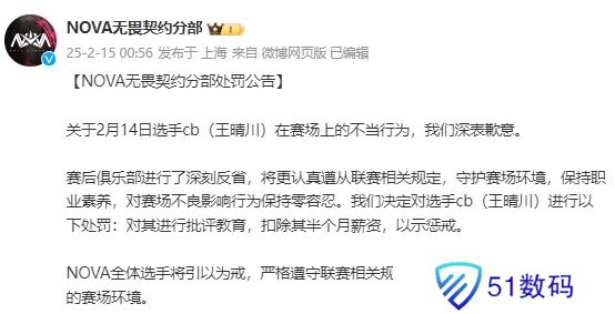 NOVA发布对cb选手的俱乐部处罚公告: