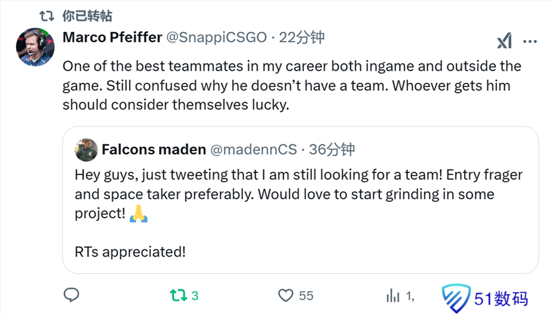 而他的老队友Snappi也转发了他的动态,并且表示他是自己职业生涯中遇到最棒的队友之一。
