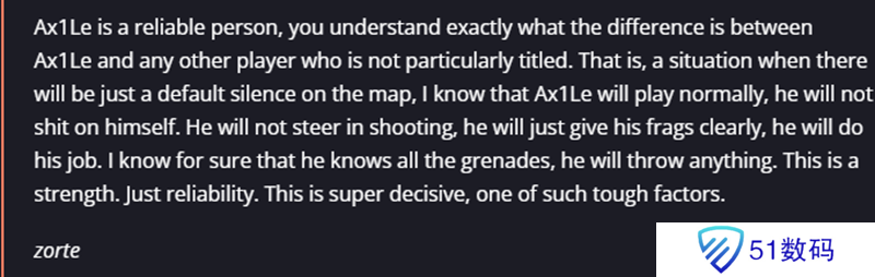 “Ax1Le是个可靠的人,你能确切地明白他和其他心态一般的选手之间的区别。比如说,在地图上出现那种僵持的局面时,我知道Ax1Le仍会正常发挥,他不会搞砸。他开枪时不会慌乱,会稳稳地拿下击杀,做好自己的工作。我敢肯定,他对所有投掷物都了如指掌,该扔什么就扔什么。这就是他的优势,就是可靠。这非常关键,也是他的突出特质之一。 ”