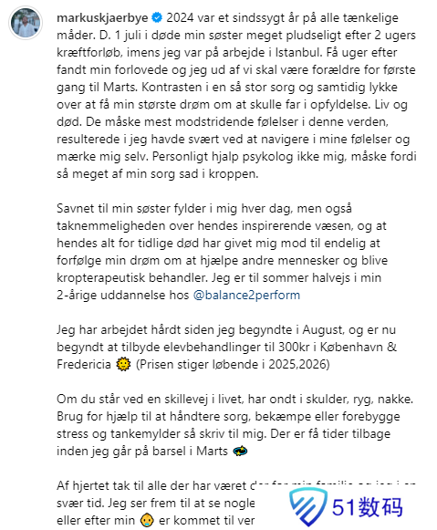 Kjaerbye宣布孩子即将出生 发表长文感叹并分享人生近况