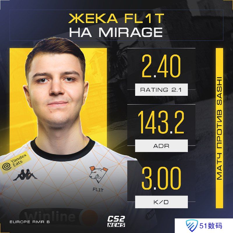 Sashi战队顺利晋级上海Major。本场比赛VP队内步枪手FL1T在决胜图Mirage上打出24-8 K-D,143.2 ADR和2.40 rating的惊人数据,助力队伍取得胜利。