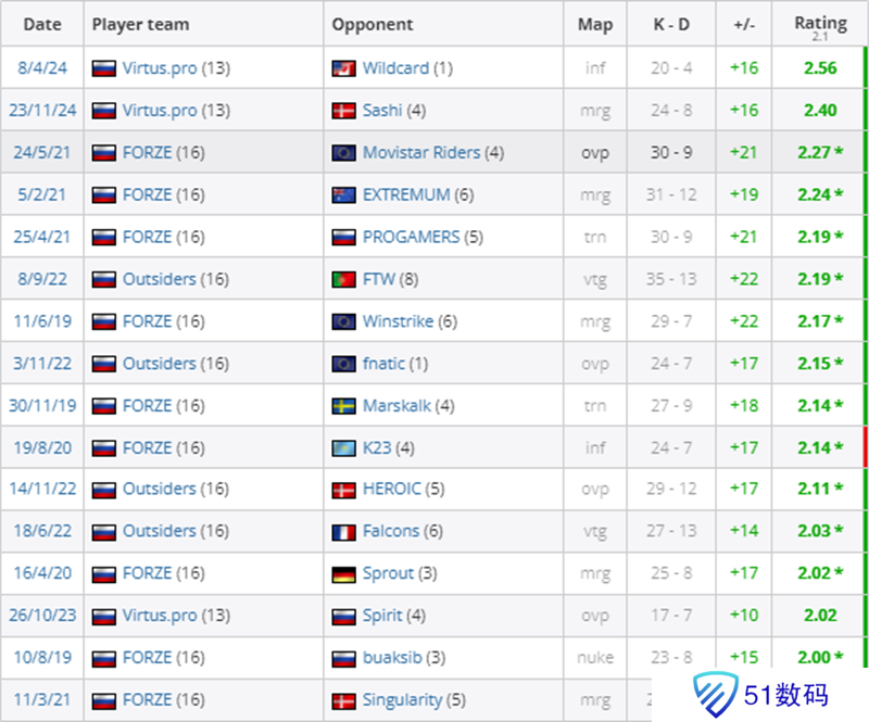 以下为FL1T职业生涯所有rating大于2.0的对阵场次: