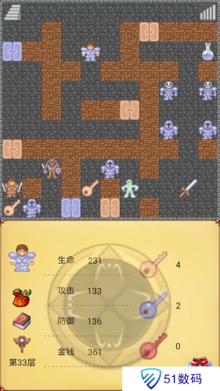 回到1层,向上清理一二区所有不消耗钥匙就能打的怪,搜刮所有钥匙和宝石,血瓶留着。至此属性78/126,加两次防。不够上楼清必经之路的无伤怪物。78/158