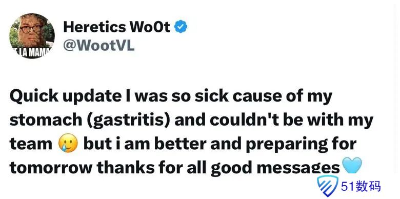 WOOT在社交媒体上向粉丝说明情况,表示自己因健康问题缺席比赛,并对队伍的努力表示支持,同时感谢大家的鼓励。他透露自己正在康复中,并准备迎接接下来的比赛。