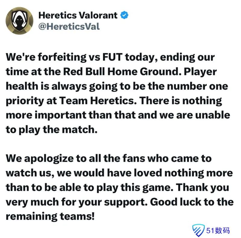 然而,由于队伍整体状况不佳,Heretics在次日宣布退出与FUT的比赛。战队官方表示,“选手的健康始终是Heretics的首要任务”,出于对选手身体状况的考量,他们无法完成本场比赛,并感谢所有支持他们的粉丝。战队也向剩余参赛队伍表达了祝愿。