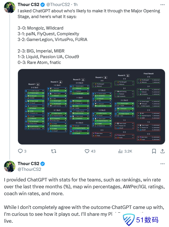 “我向ChatGPT询问了谁有可能通过Major开幕式阶段,结果如下: