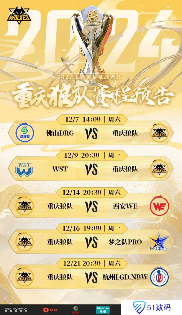 虎扑11月26日讯 狼队发布挑杯小组赛程:揭幕战对阵DRG,一半以上为黄金档!