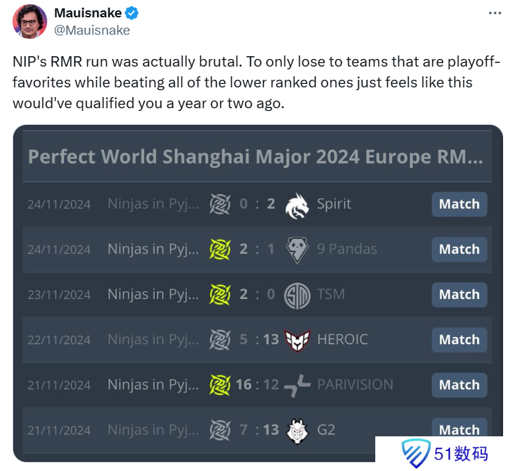 Mauisnake:“NIP的RMR之旅其实非常艰难。他们仅仅输给那些被看作淘汰赛的热门战队,而战胜了所有排名较低的队伍。要是放在一两年前,这种表现感觉足以晋级。”