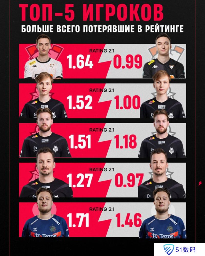 近日,有外媒统计了两届CS新版本Major前的RMR赛事中数据下滑最为明显的5名选手。