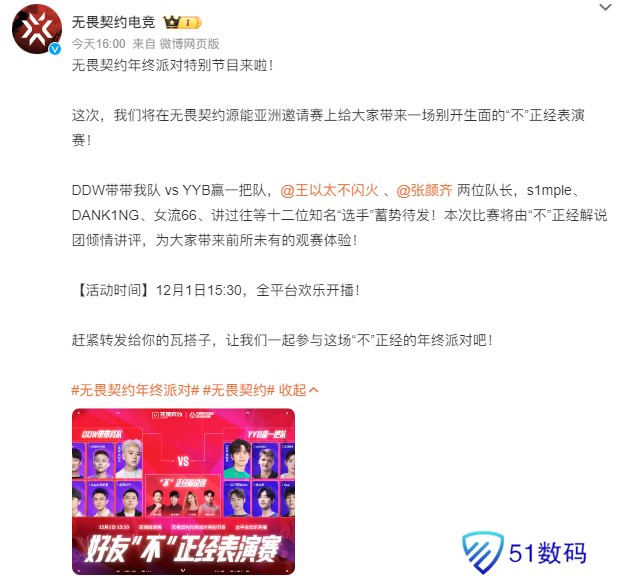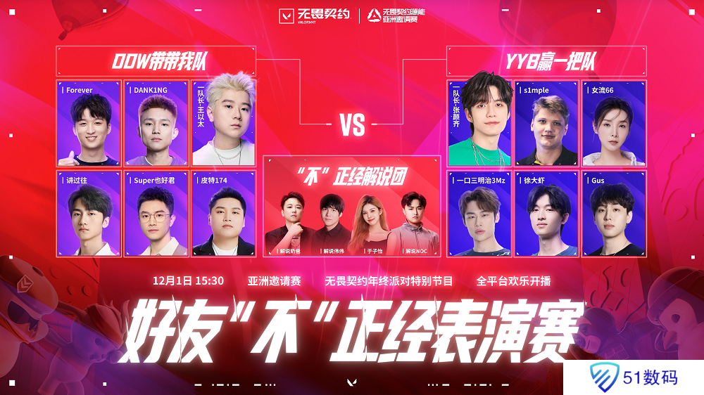DDW带带我队 vs YYB赢一把队,@王以太不闪火 、@张颜齐 两位队长,s1mple、DANK1NG、女流66、讲过往等十二位知名“选手”蓄势待发!本次比赛将由“不”正经解说团倾情讲评,为大家带来前所未有的观赛体验!