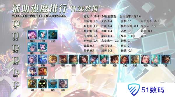 辅助热度排行:王昭君出场率开始反弹,辅助妲己数据突出