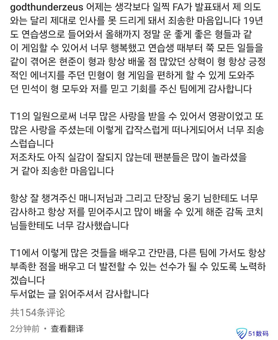 非常感谢一直照顾我的经纪人和团长WOONG GI 也感谢一直相信我 让我学到很多东西的教练们,因为在T1学到了很多东西 所以去其他队也会努力学习不足之处 成为能够进步的选手。感谢你阅读这篇没有条理的文章。