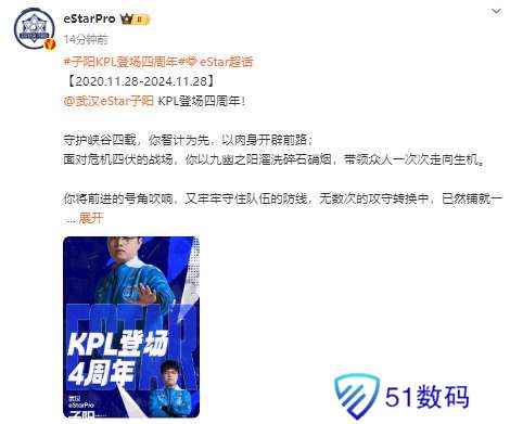 虎扑11月28日讯 子阳登场KPL四周年,ES发文:是你,带领众人一次次走向生机