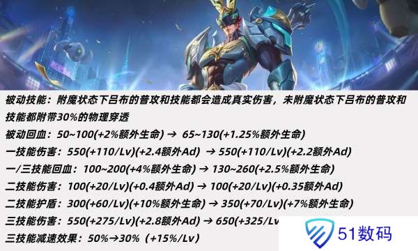 以前吕布附魔后普攻/一/三技能挥戟为真实伤害,改动后处于附魔状态时,二技能以及三技能法阵边缘也会变成真实伤害。